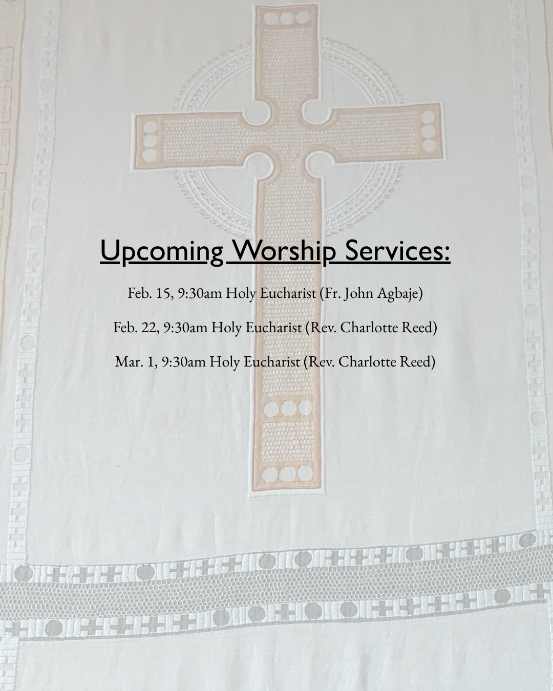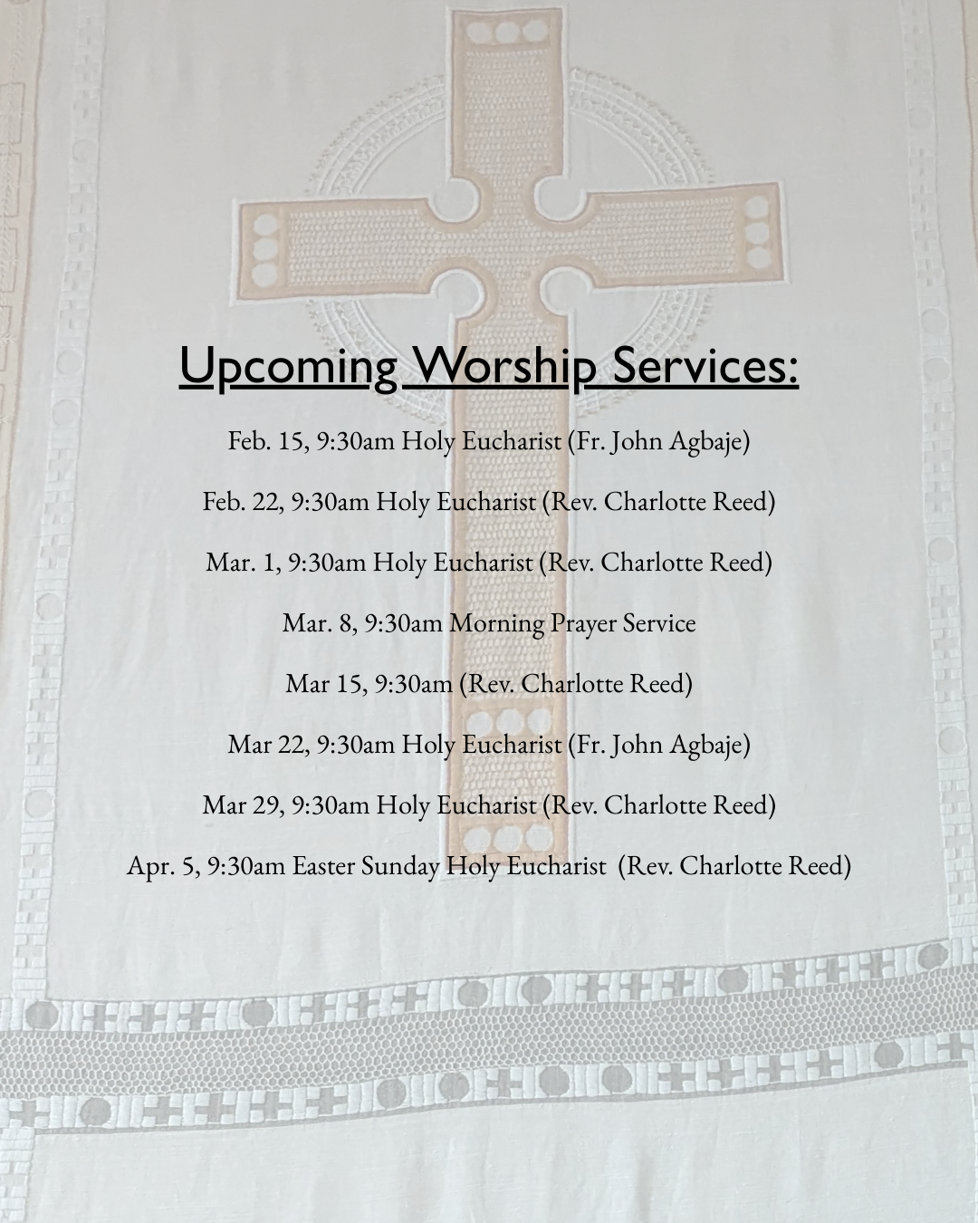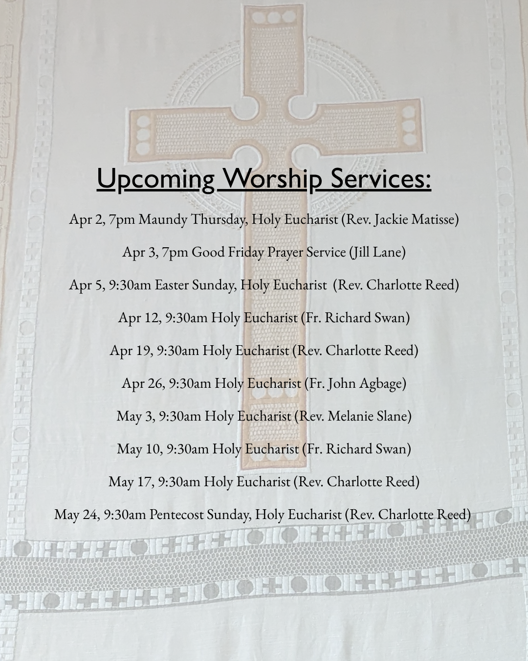 Sunday Worship 9:30am, followed by coffee hour
